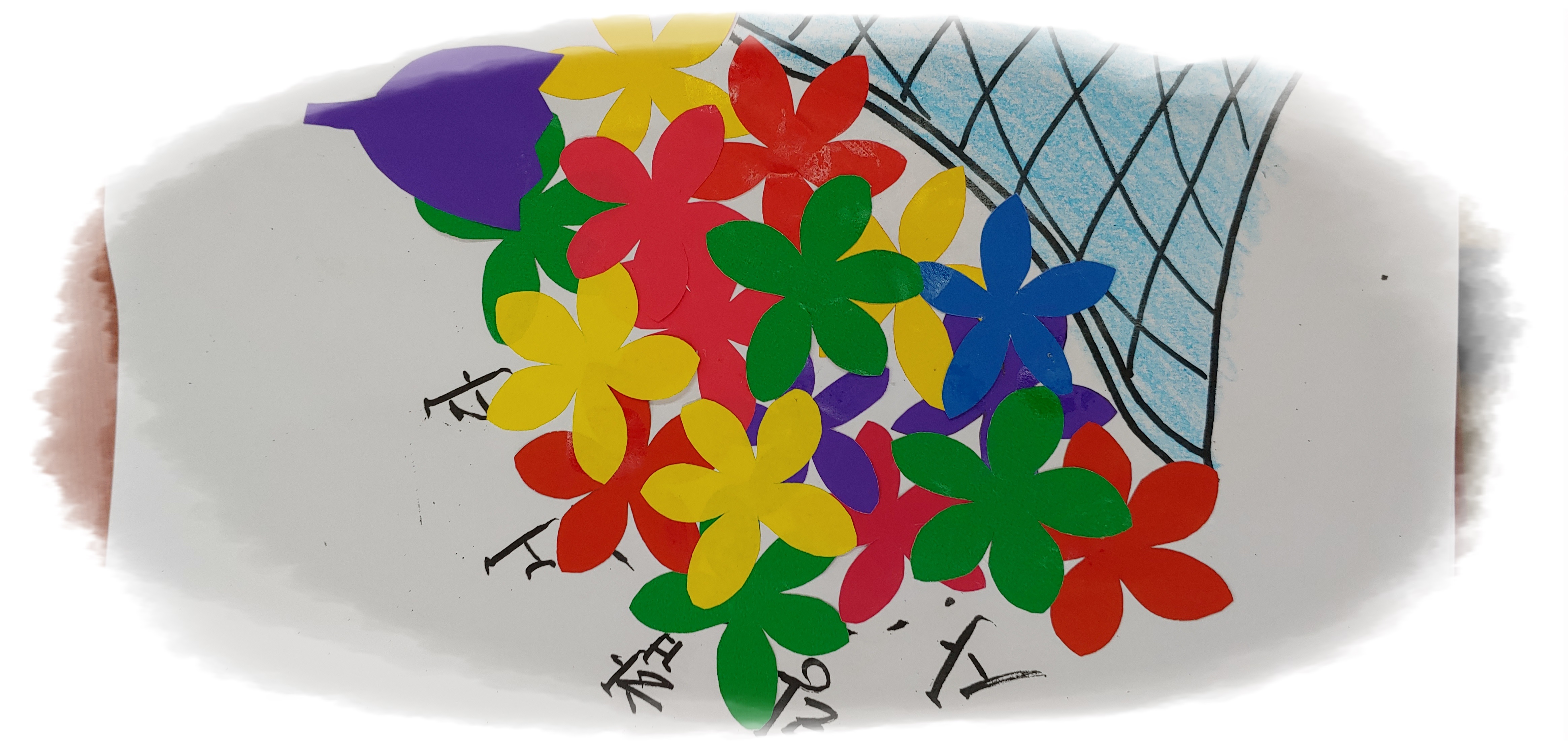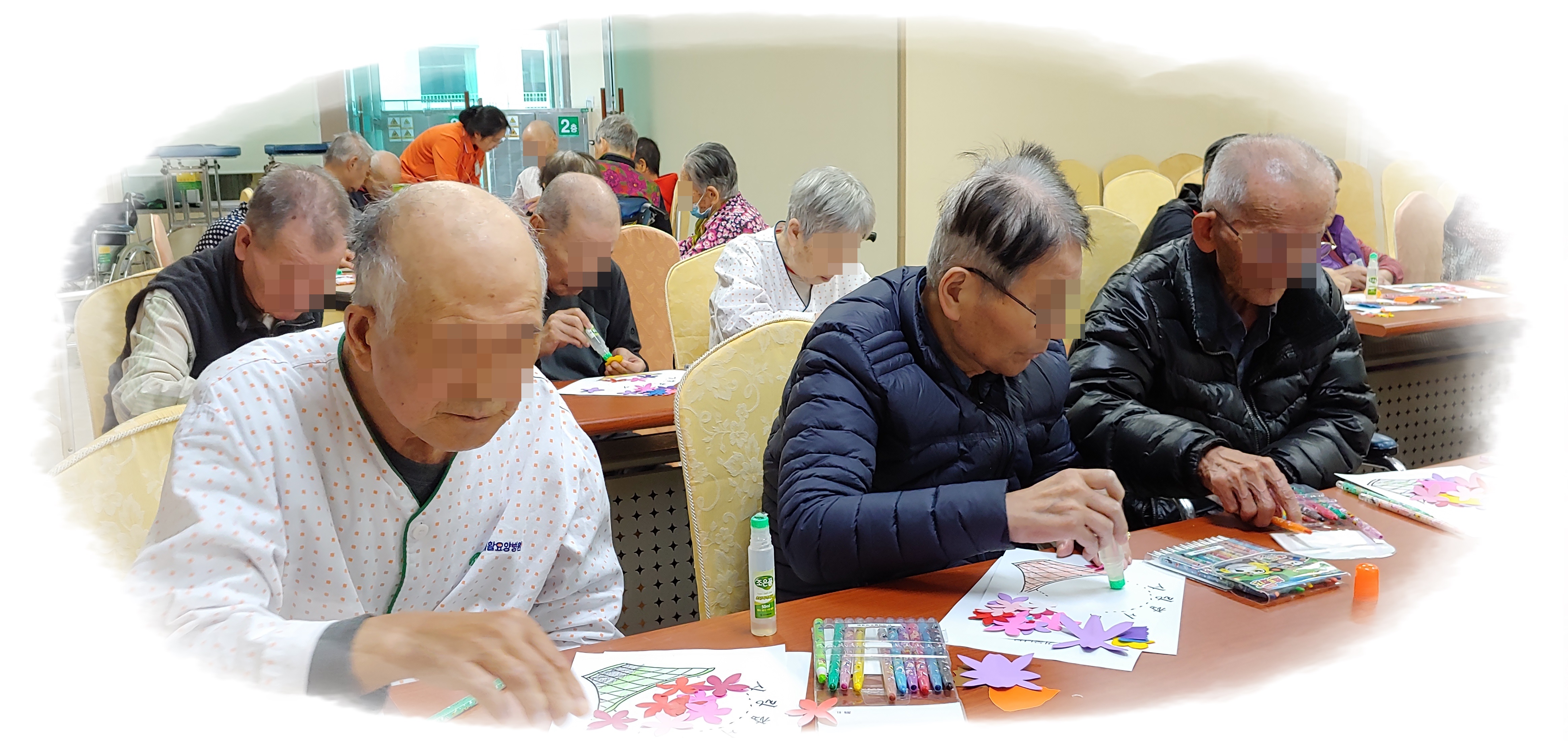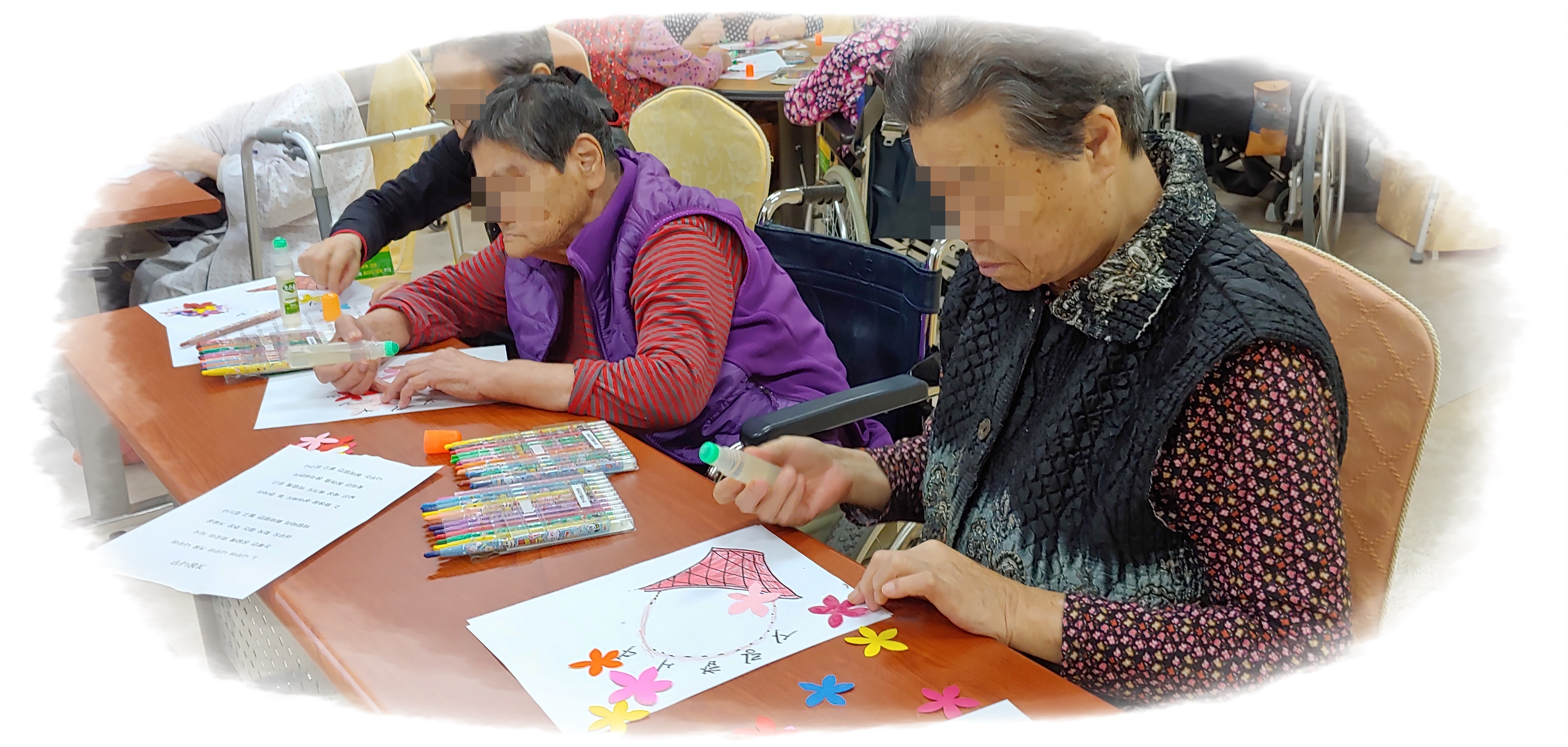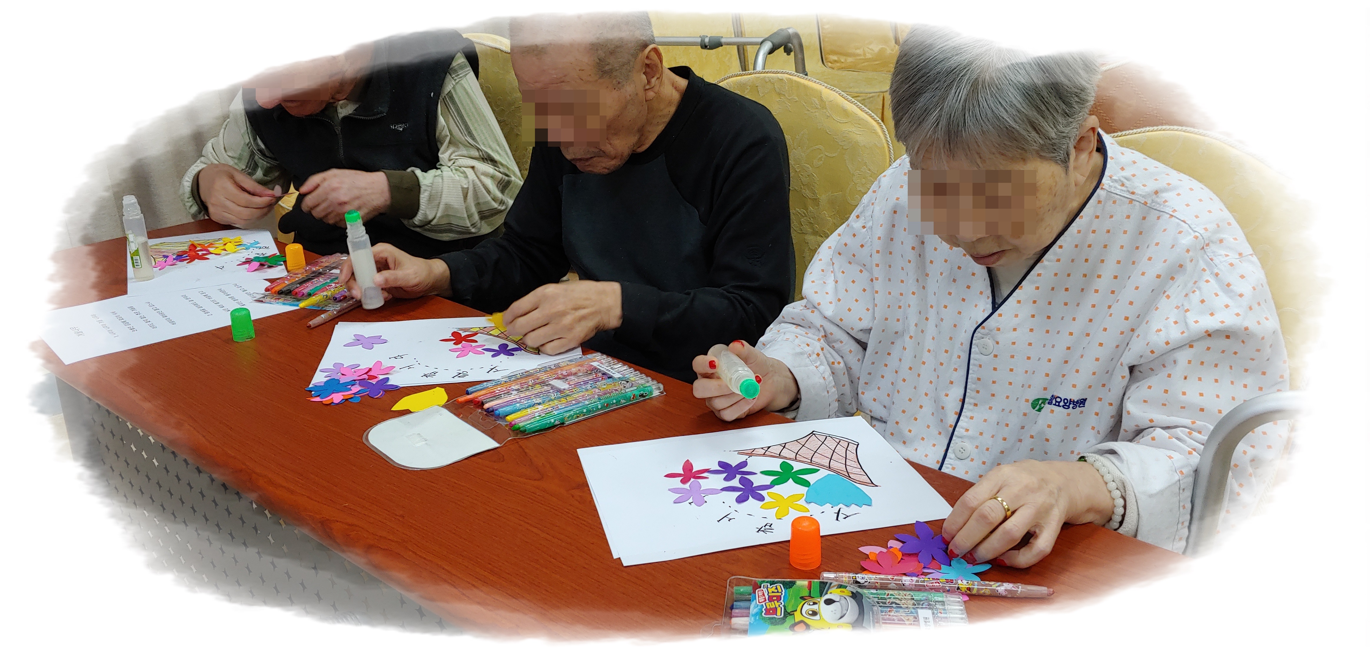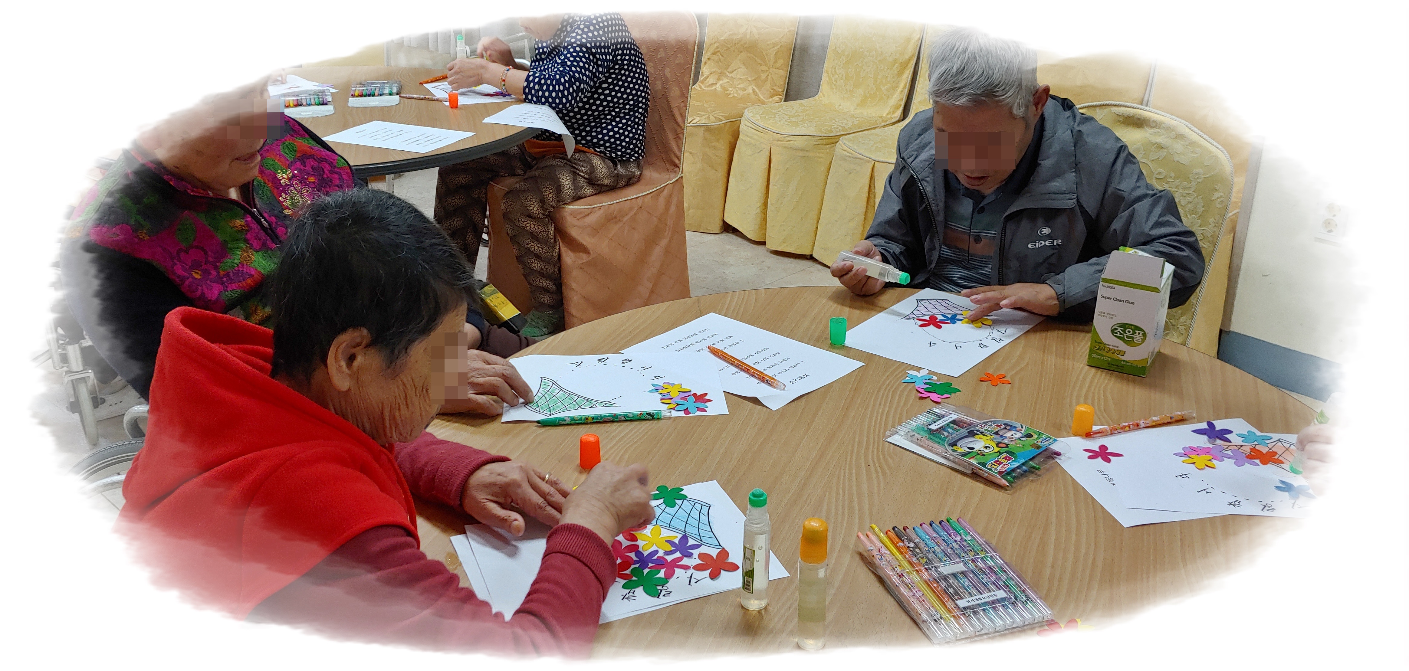 어르신들이 색칠한 바구니에 풀로 붙여 꽃바구니를 완성했습니다.