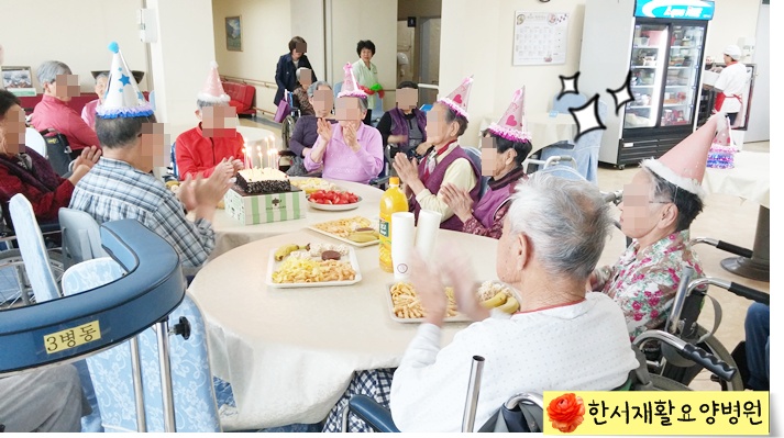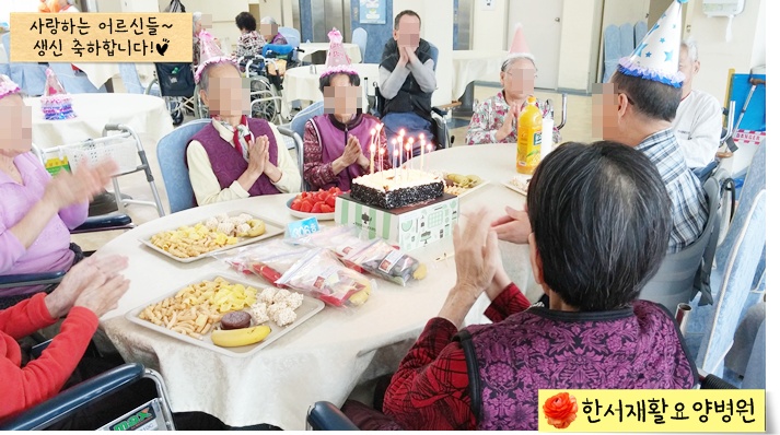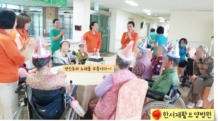 어르신들과 직원들이 함게 생일 축하 노래를 부르며